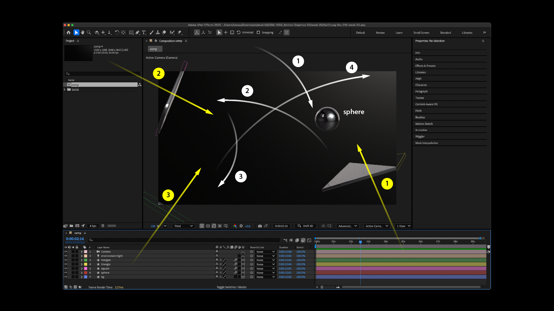 In the final step, I animated each object according to my storyboard. I manually keyframed their paths and rotations, carefully simulating realistic reactions when the shapes collide or interact. I always needed to open the 4-view windows in After Effects to fine-tune each movement in 3D space, making sure the motion paths were accurate and the animation stayed smooth.