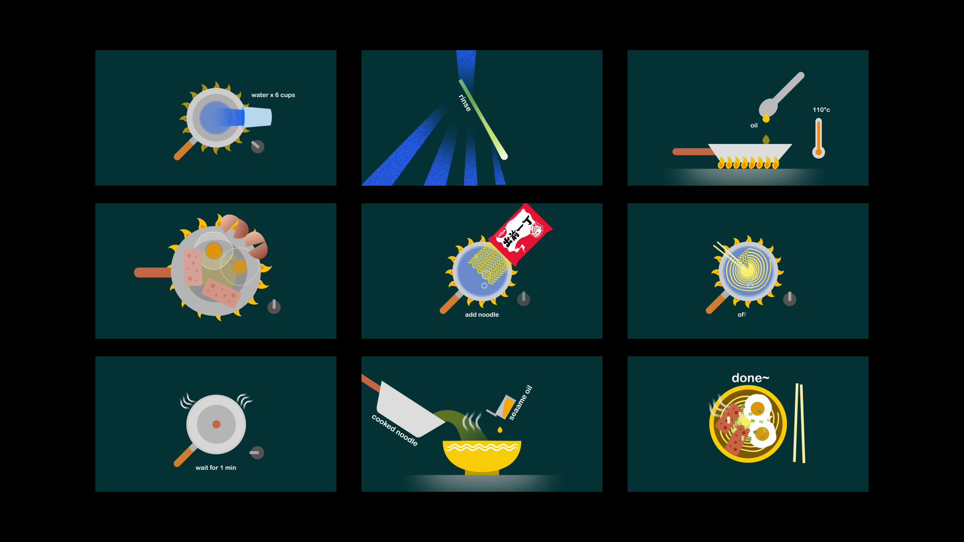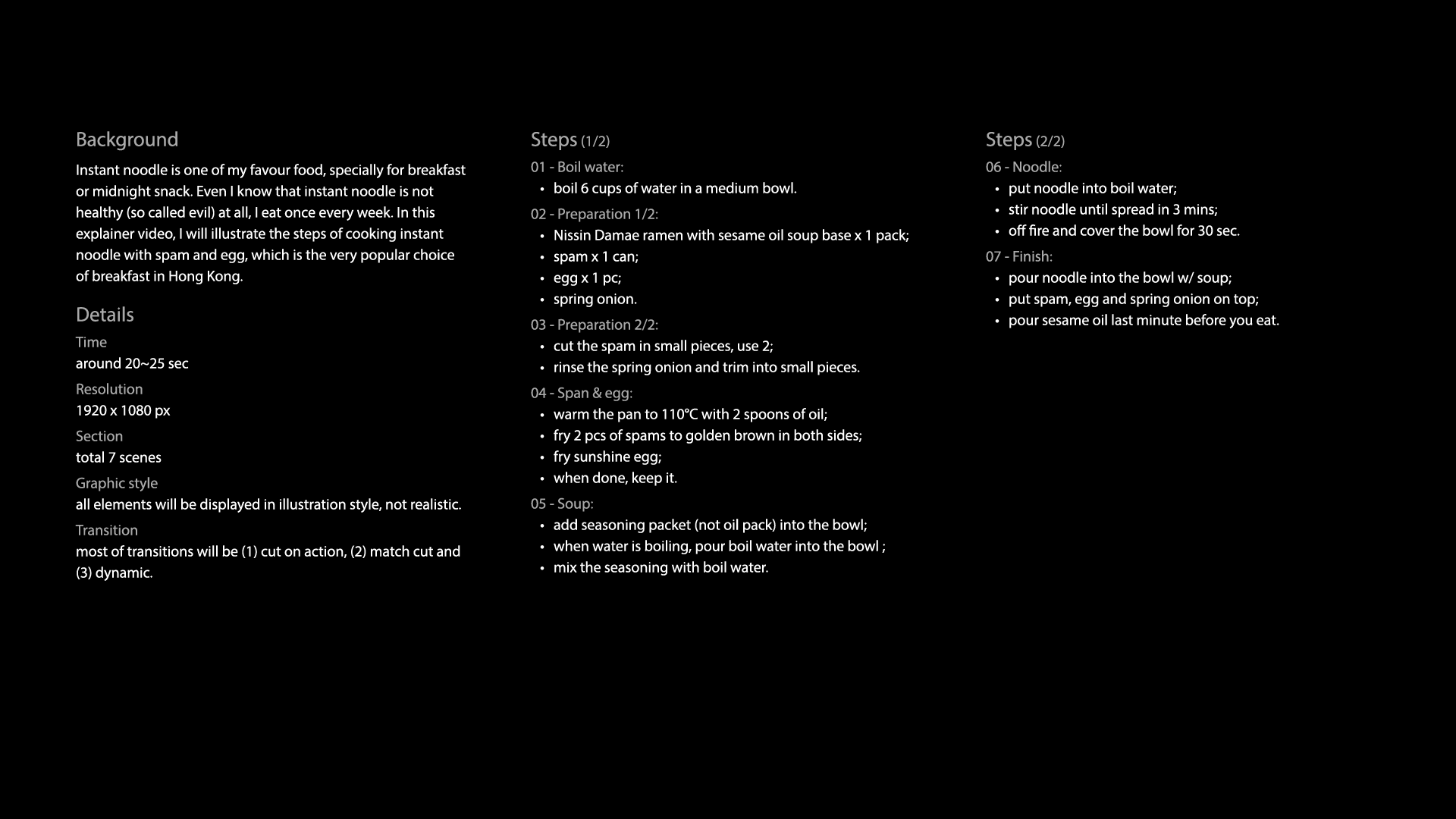 My explainer video teaches how to cook instant noodles with spam and egg. I wrote the full script and cooking steps first, then planned out the scenes while thinking about visual style. This helps me organize animation and design at the same time.