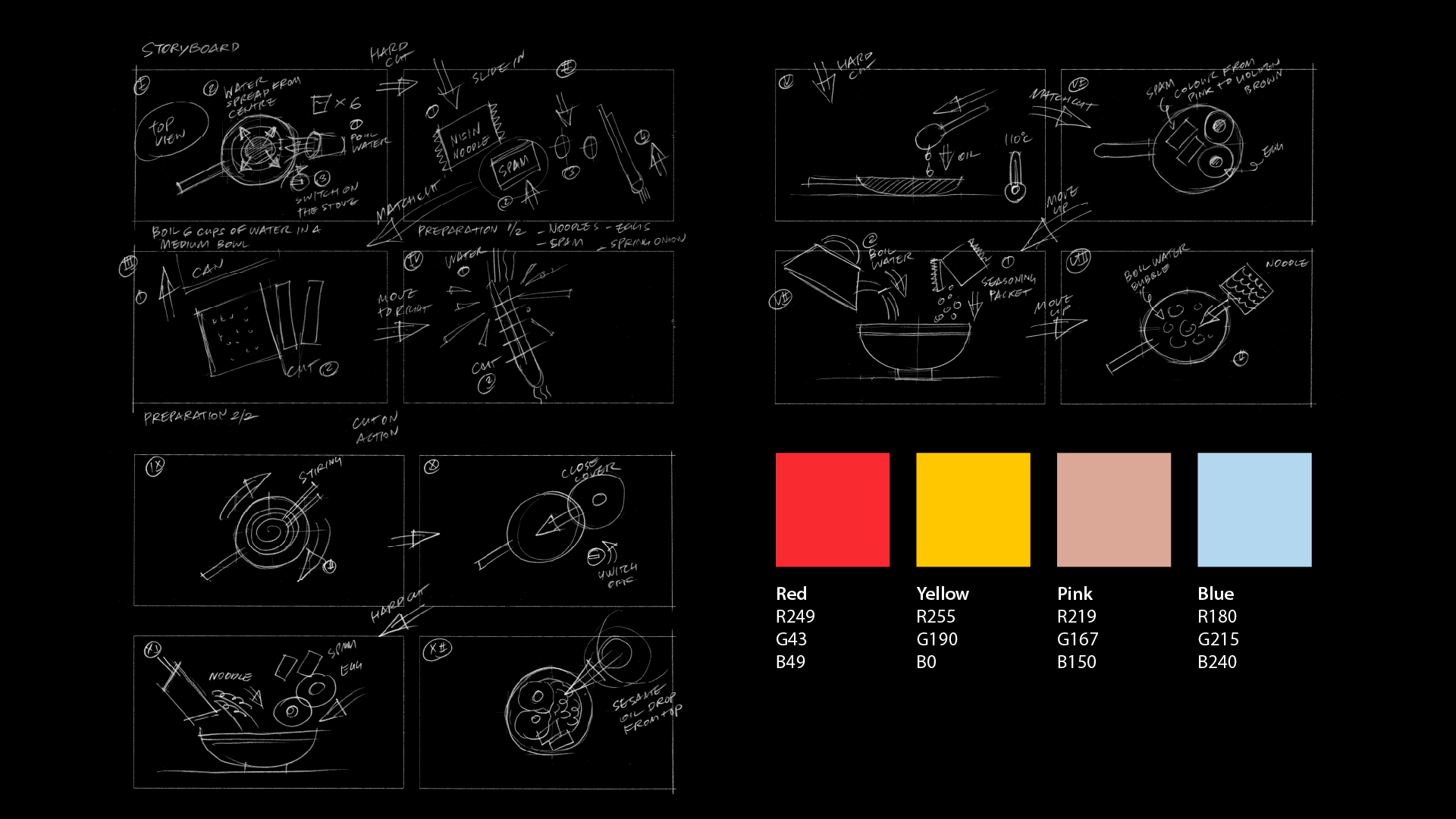 Next, I sketched the storyboard based on my written script. Each frame shows a key cooking step, with arrows and notes for motion and transitions. I carefully chose camera angles to ensure each action is clearly visible. I also defined a bold colour palette: red, yellow, pink, and blue to create an energetic and playful look that keeps the video visually engaging and easy to follow.