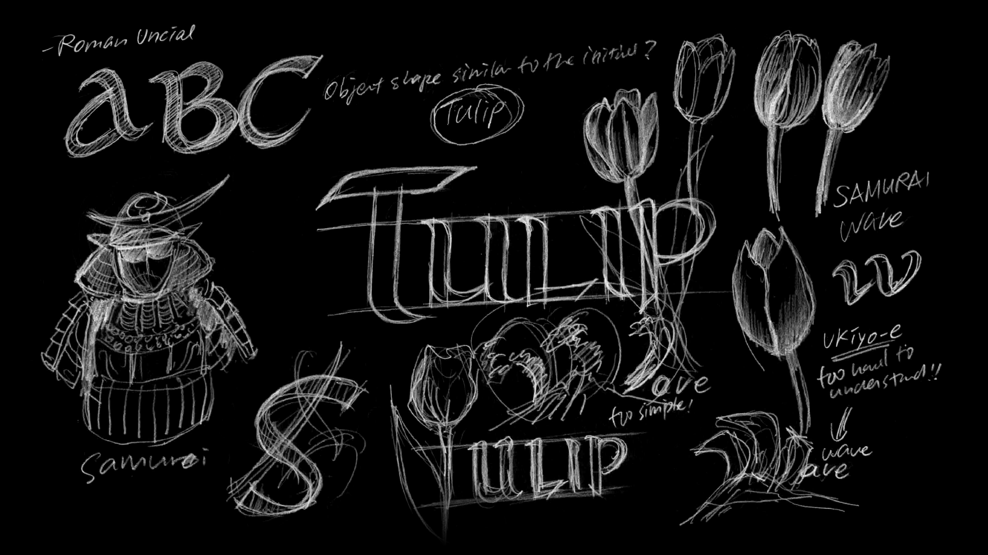I chose Roman Uncial for its bold, rounded structure, then explored visual objects that echo its capital forms. I matched Tulip with “T” for its tall stem and bloom, Samurai with “S” for armor curves, and Wave with “W” for fluid motion. Each pairing builds on visual similarity while enriching meaning through symbolic association.