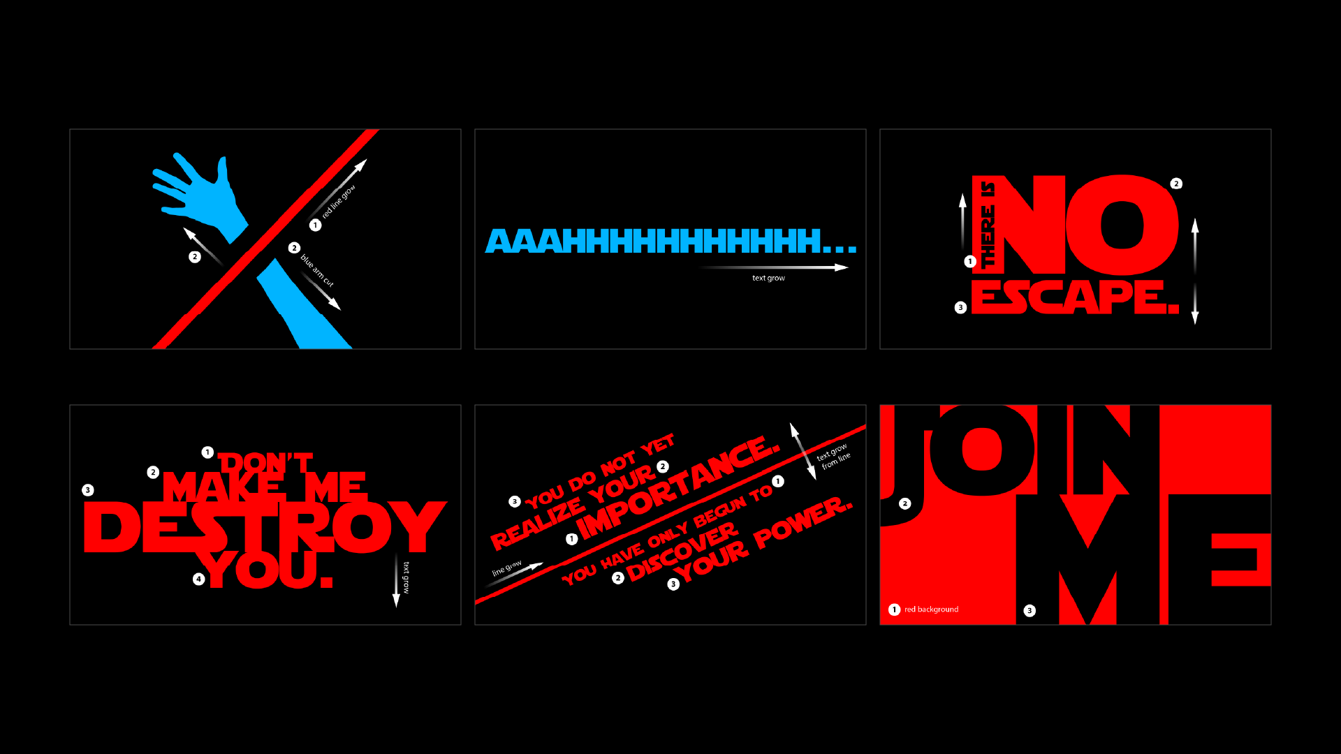 I transcribed the full dialogue from the “I am your father” scene and broke it down into individual lines. Each line was treated as a separate script for animation. Based on the storyboard, I planned how each line would enter, exit, and animate. Vader’s lines use heavy, ominous movements; Luke’s lines are faster, louder, and emotional.