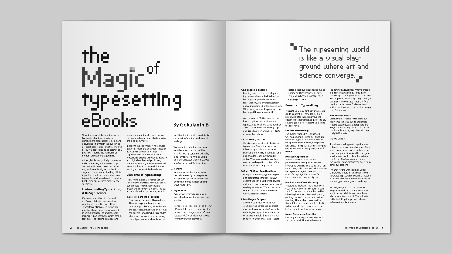 This is my final spread, completed in InDesign using a 6-column grid. I chose Pixelify for the headline and pull quote to visually reflect the digital theme of “The Magic of Typesetting eBooks.” The pixel-style typeface reinforces the content’s focus on digital formats, while Myriad Pro supports legibility for body text. I maintained clear hierarchy, balanced whitespace, and consistent alignment throughout. The pull quote adds contrast and rhythm, while the running footer and folios meet layout requirements — resulting in a cohesive, expressive, and readable editorial design.