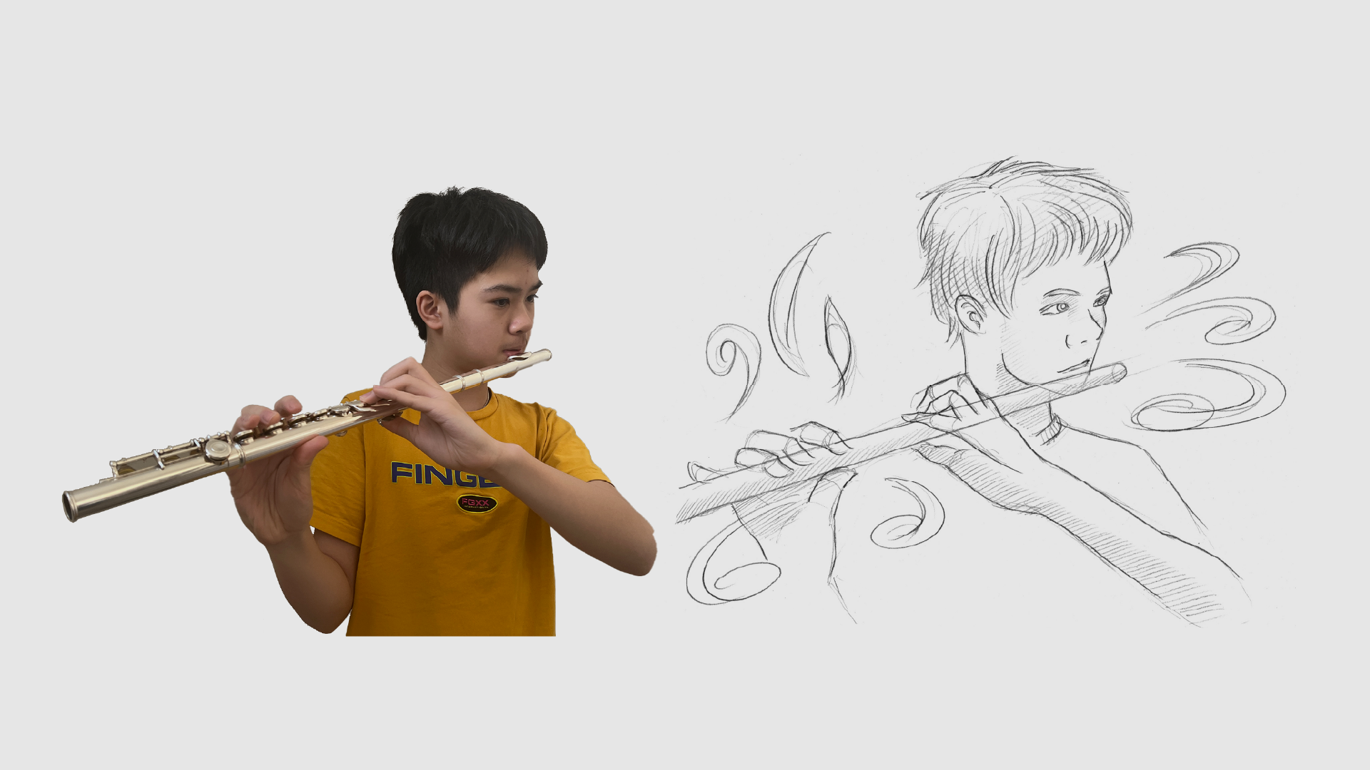 I chose the theme of “playing flute” and used my son as the model. I captured a still frame from a short mobile video to check if the motion was suitable. Then I traced one drawing by hand (and scanned) to test the pencil sketch style. I also experimented with dry-paint brushes to evaluate which line quality could express the mood better before committing to the full rotoscoping process.