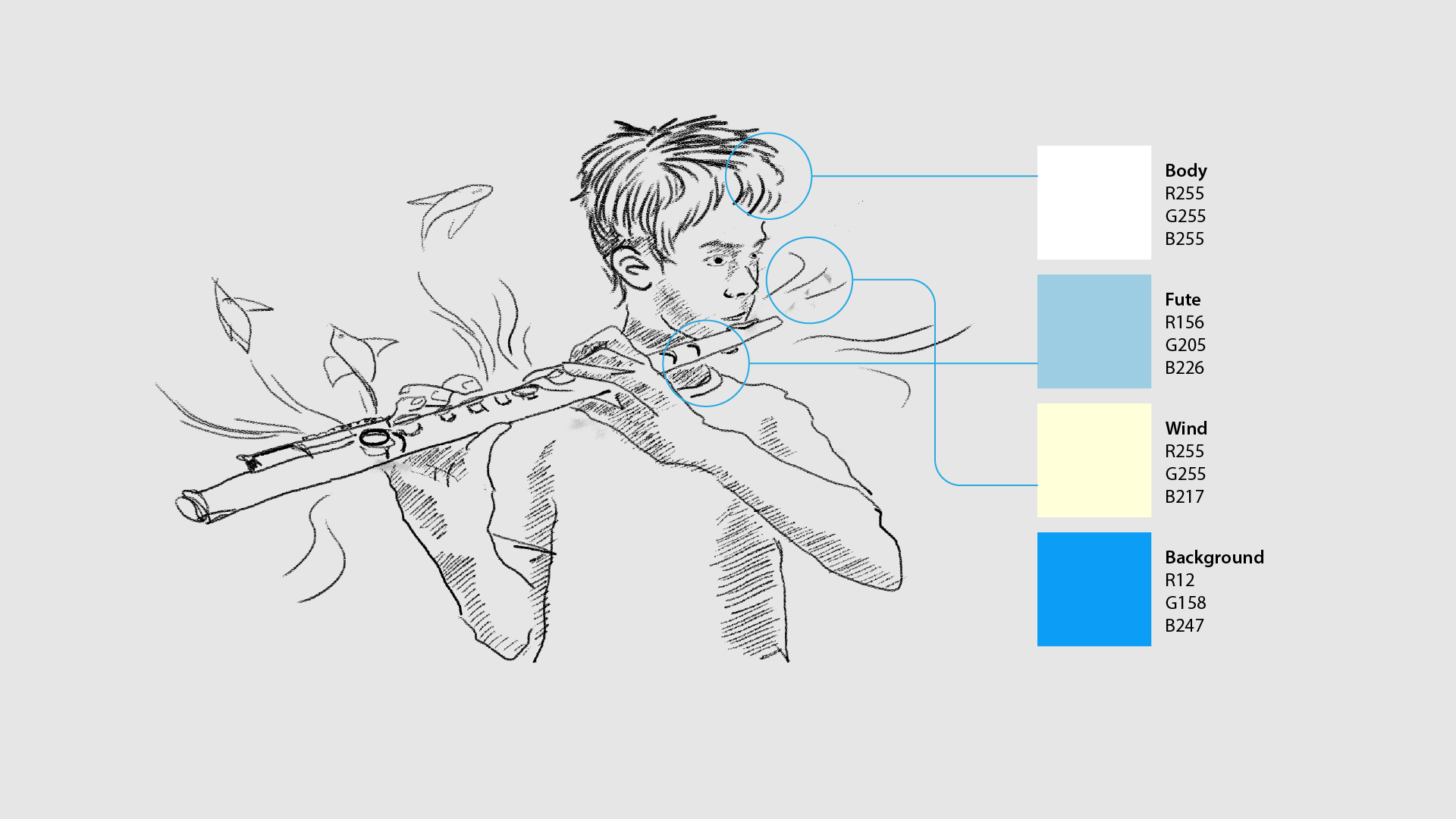 I defined the color palette based on the calm and light sound of the flute. Blue was used as the main background color to express clarity and airiness. I used white for the body, soft blue for the flute, and light beige for the airwaves. This combination aims to create a clean and gentle atmosphere, matching the peaceful tone of the scene and enhancing the mood of the animation.