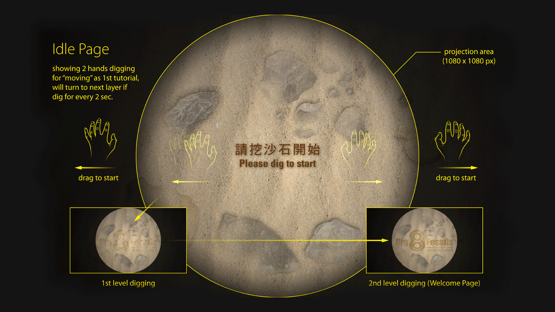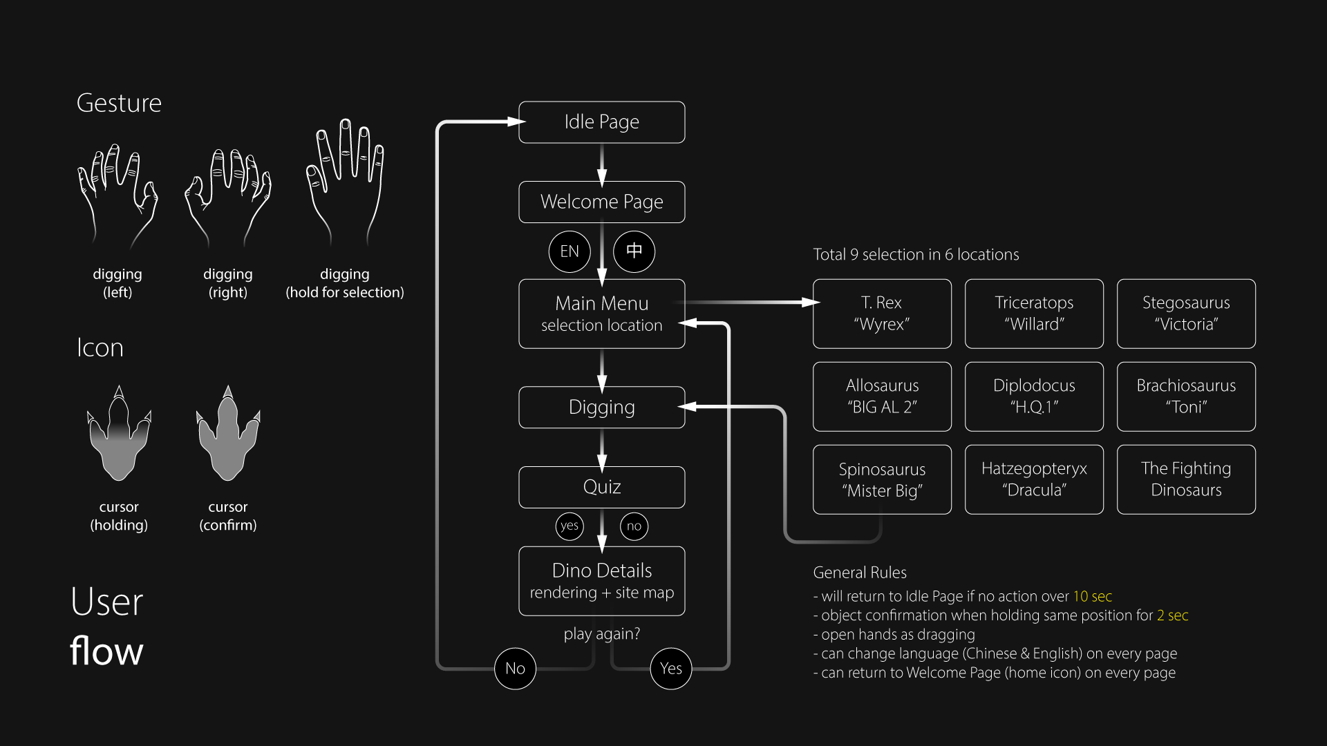 Delivered a repeatable, low-error touchless flow with measurable rules: 9 selectable dig locations, 4 digging layers, 2-second hold confirmation, 10-second idle return. The system scales cleanly across two languages and supports replay via “play again.”