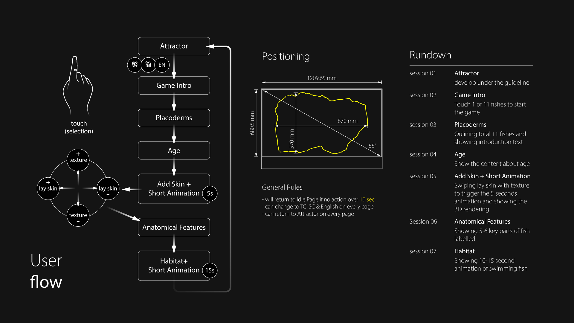 Exploit TOLED transparency without blocking the exhibit. Controls had to be discoverable, readable in a dim gallery, and usable for quick learning while guiding eyes between screen and specimen.