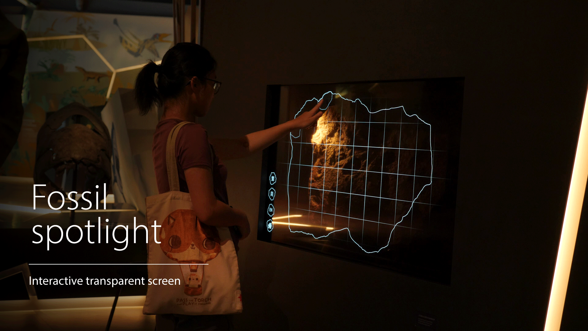 I storyboarded a “reveal” flow: minimal UI framing on the transparent screen, layered outlines/grids for orientation, and content modules for age, skin, anatomy, and habitat. Spotlights were sequenced to highlight the corresponding fossil areas during navigation.