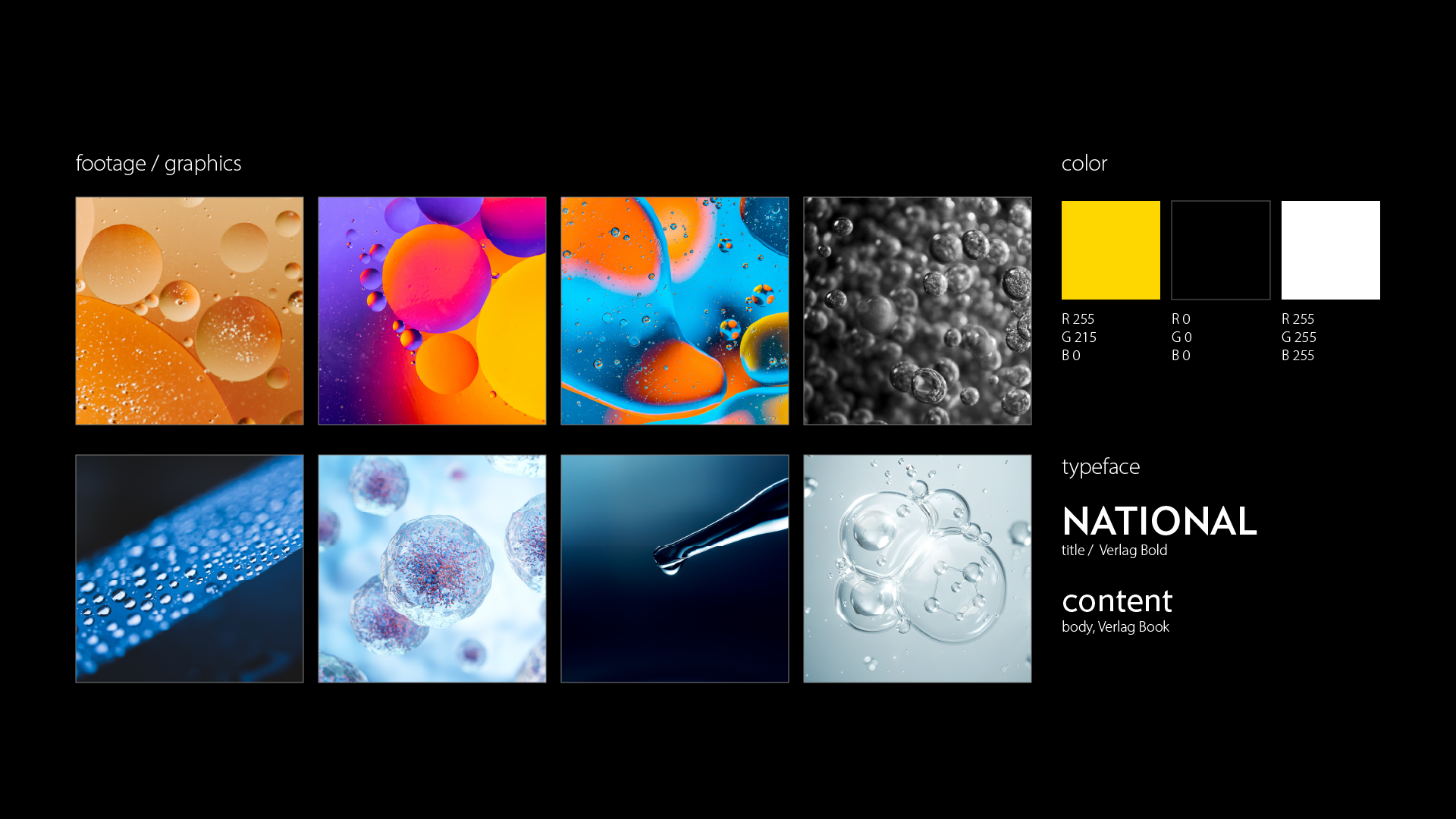 After studying National Geographic’s brand guidelines, I created a mood board for the virtual “Science Channel.” I sourced high-quality imagery and footage that reflect the theme of scientific exploration. I kept the original colour palette: yellow, black, and white, and applied the official typeface Verlag. With all assets prepared, I moved on to production.