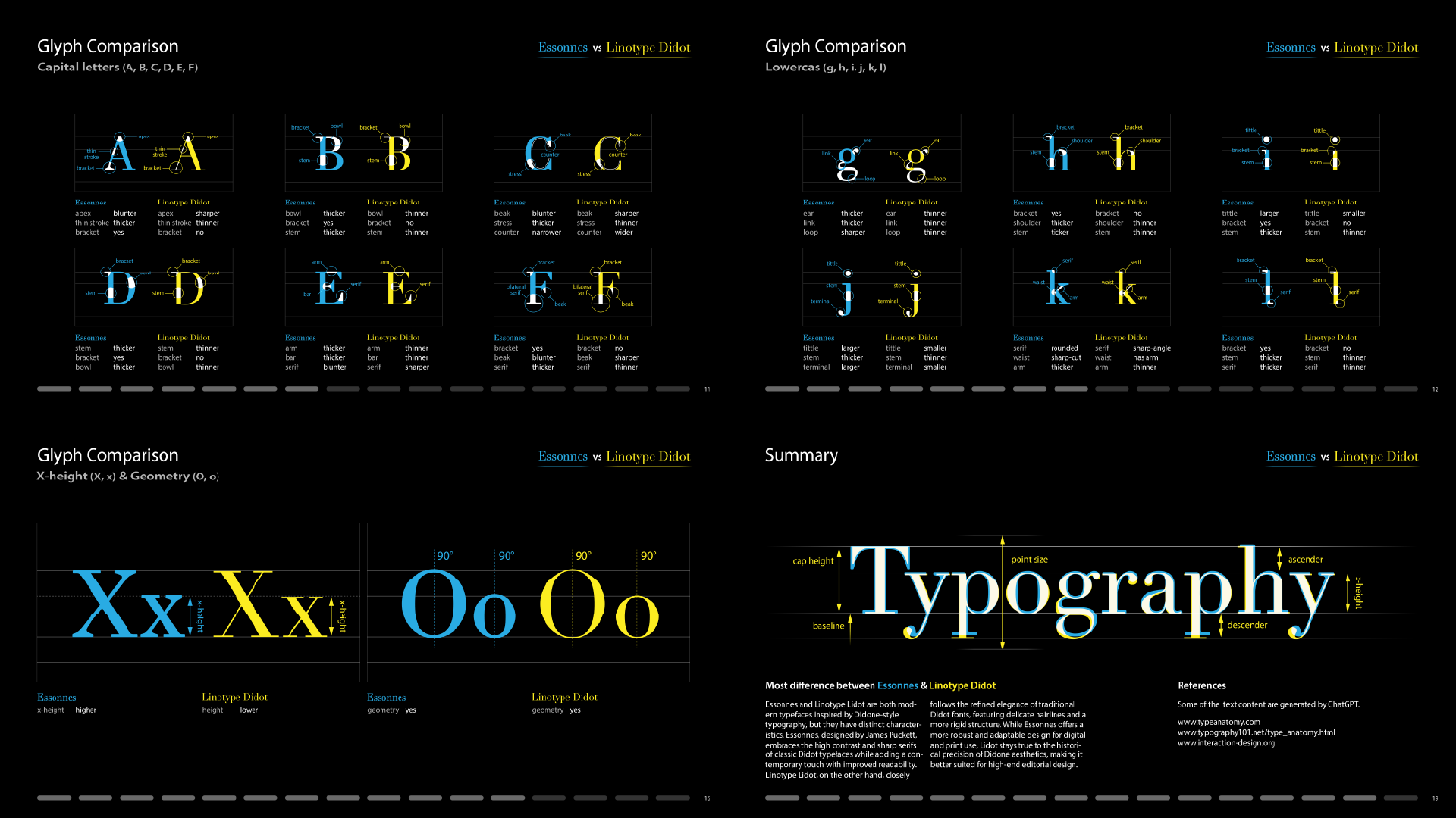 The Glyph Comparison section required the most effort. I used Illustrator to highlight subtle differences between corresponding letters in Essonnes and Linotype Didot. By importing multiple artboards into InDesign, I ensured consistency across all visuals. This step involved detailed artwork, careful labeling, and extensive proofreading to guarantee typographic accuracy. The most practical experience I gained from this assignment was learning how to organize content clearly and build a logical reading system that guides the viewer smoothly through the comparison.