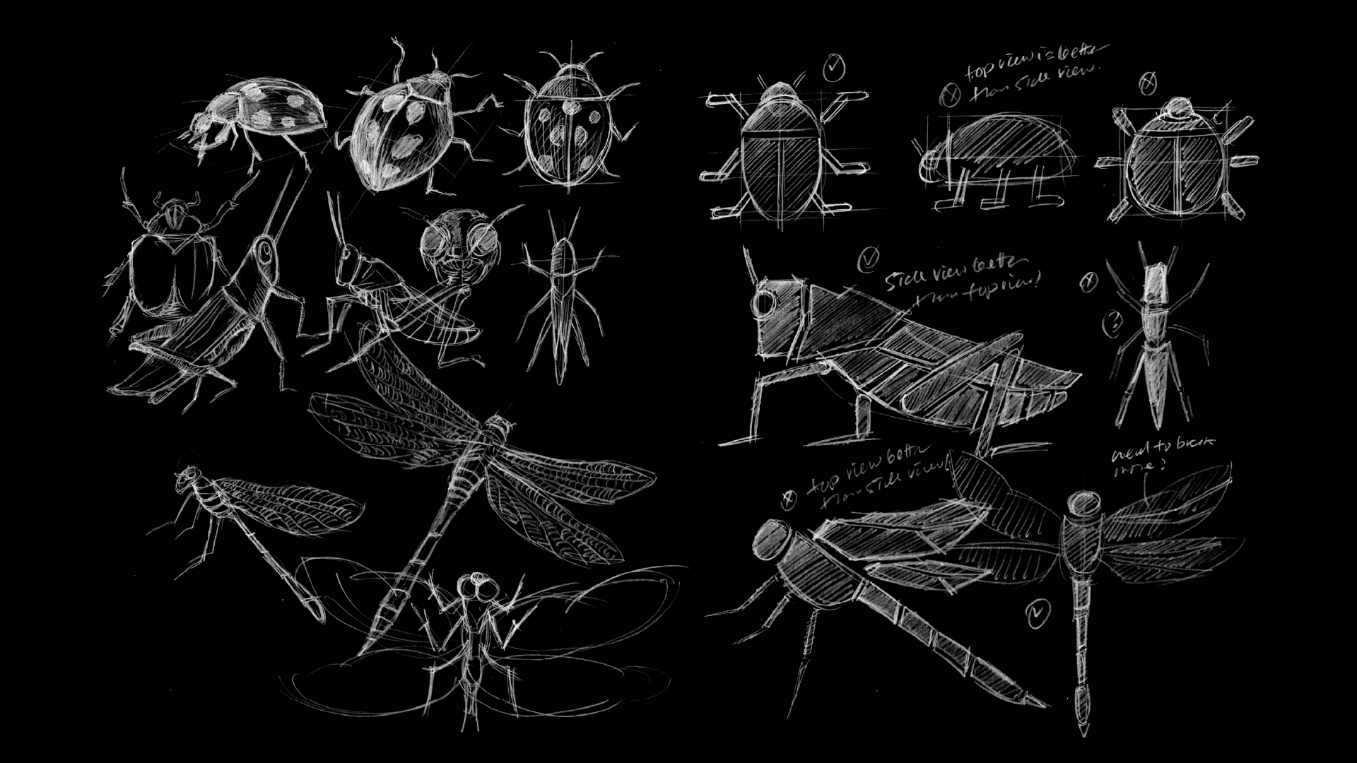 Through multiple sketches, I tested different angles and shapes to find the best way to present each insect. I compared side and top views, focusing on body proportion, wings, and legs. Each trial helped refine the structure, so the icons could remain simple yet recognizable. This stage also clarified which visual details were necessary — and which could be removed.