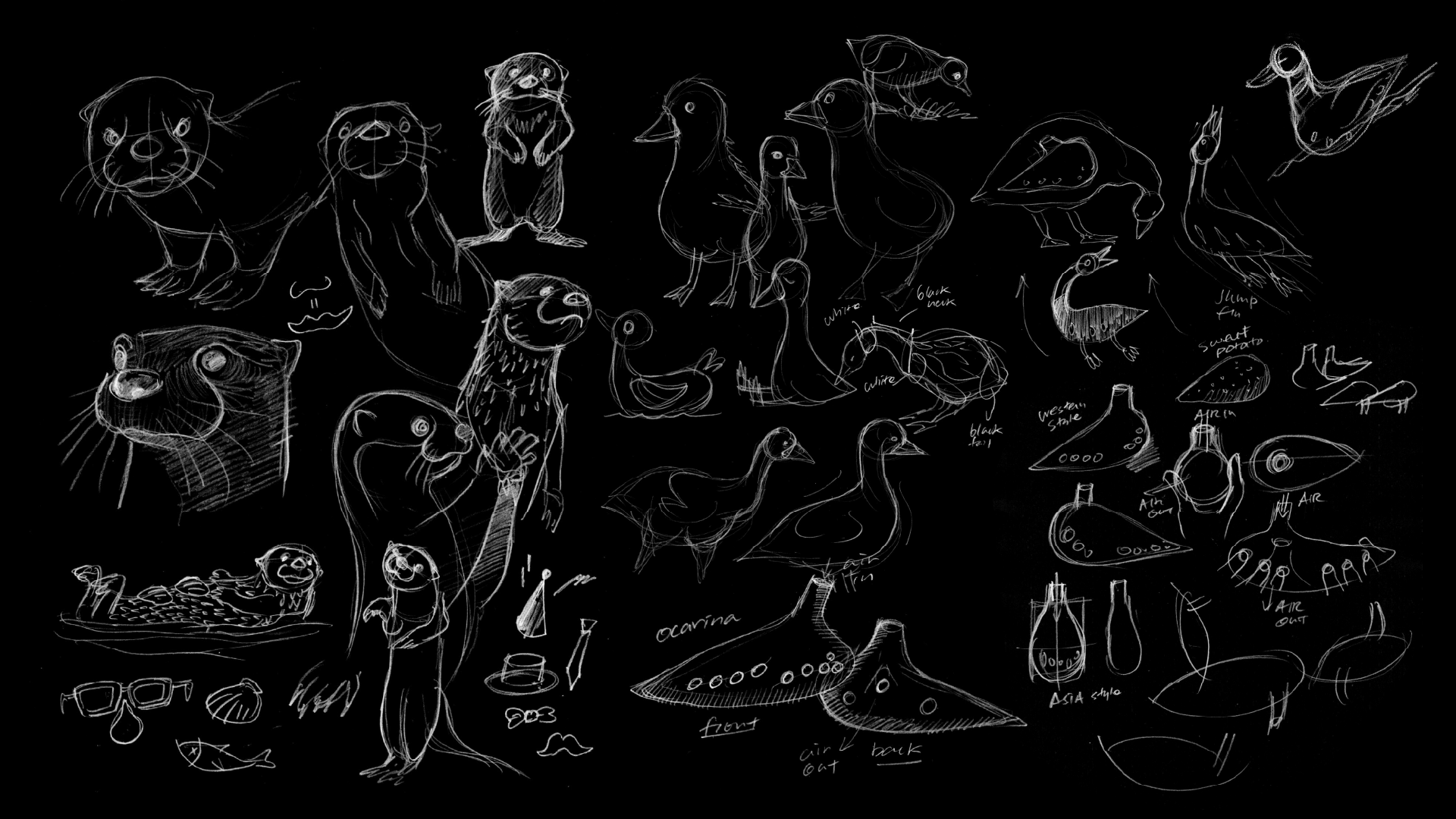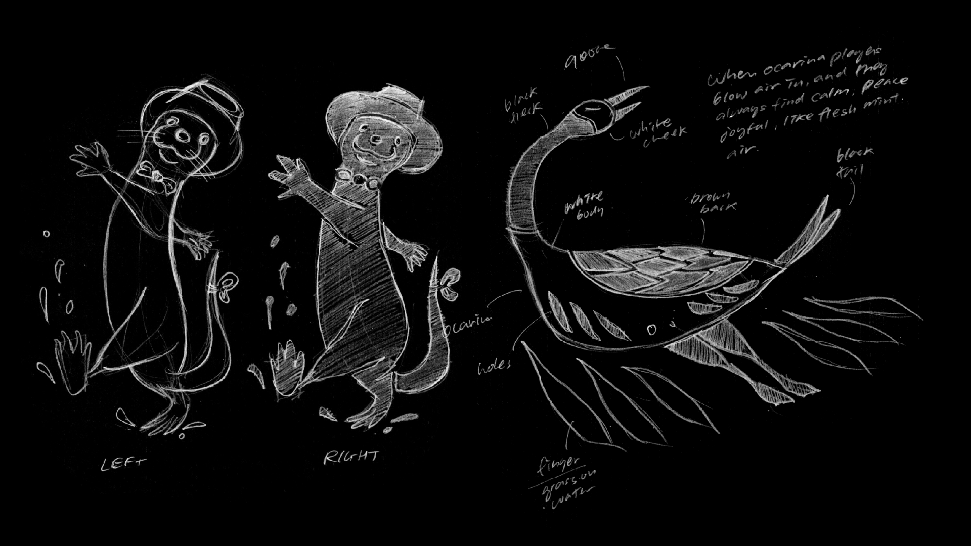This sketching explores two ideas. For the otter, I tested linework versus solid shapes to see how each style affects clarity and mood. For the ocarina, I matched it with a goose — both produce soft, breathy sounds. I studied their forms side by side, aiming to blend the instrument and bird into one simplified, sound-inspired icon.