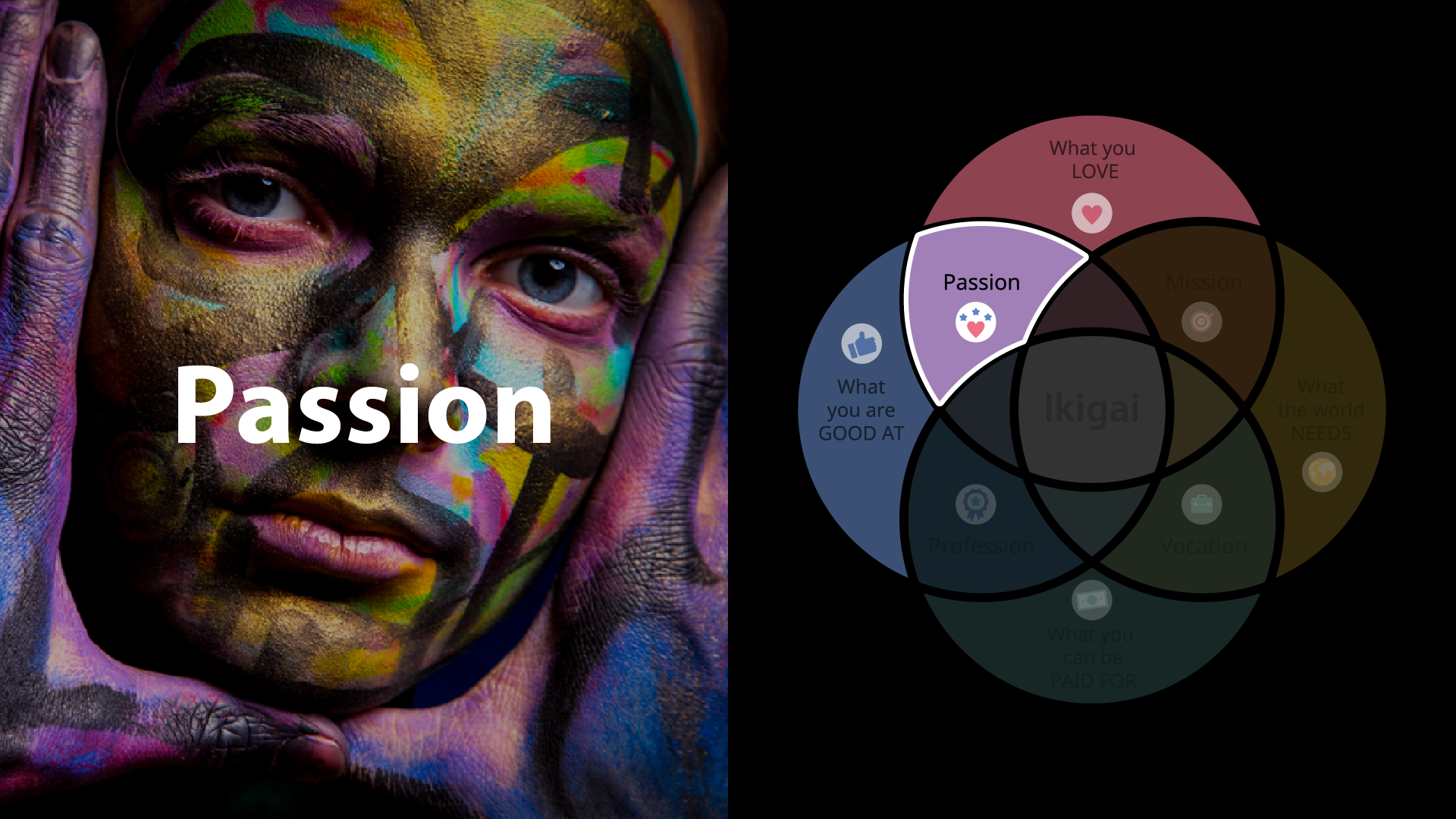I carefully selected a unique color for each Ikigai value to enhance clarity and reinforce meaning. Blue represents “Profession” for its association with reliability and skill; purple for “Passion” reflects creativity and individuality; orange for “Mission” conveys energy and ambition. These colors not only distinguish each concept visually but also evoke the emotional tone of each element. I applied them consistently across the diagram and titles to maintain coherence and strengthen the audience’s understanding throughout the presentation.