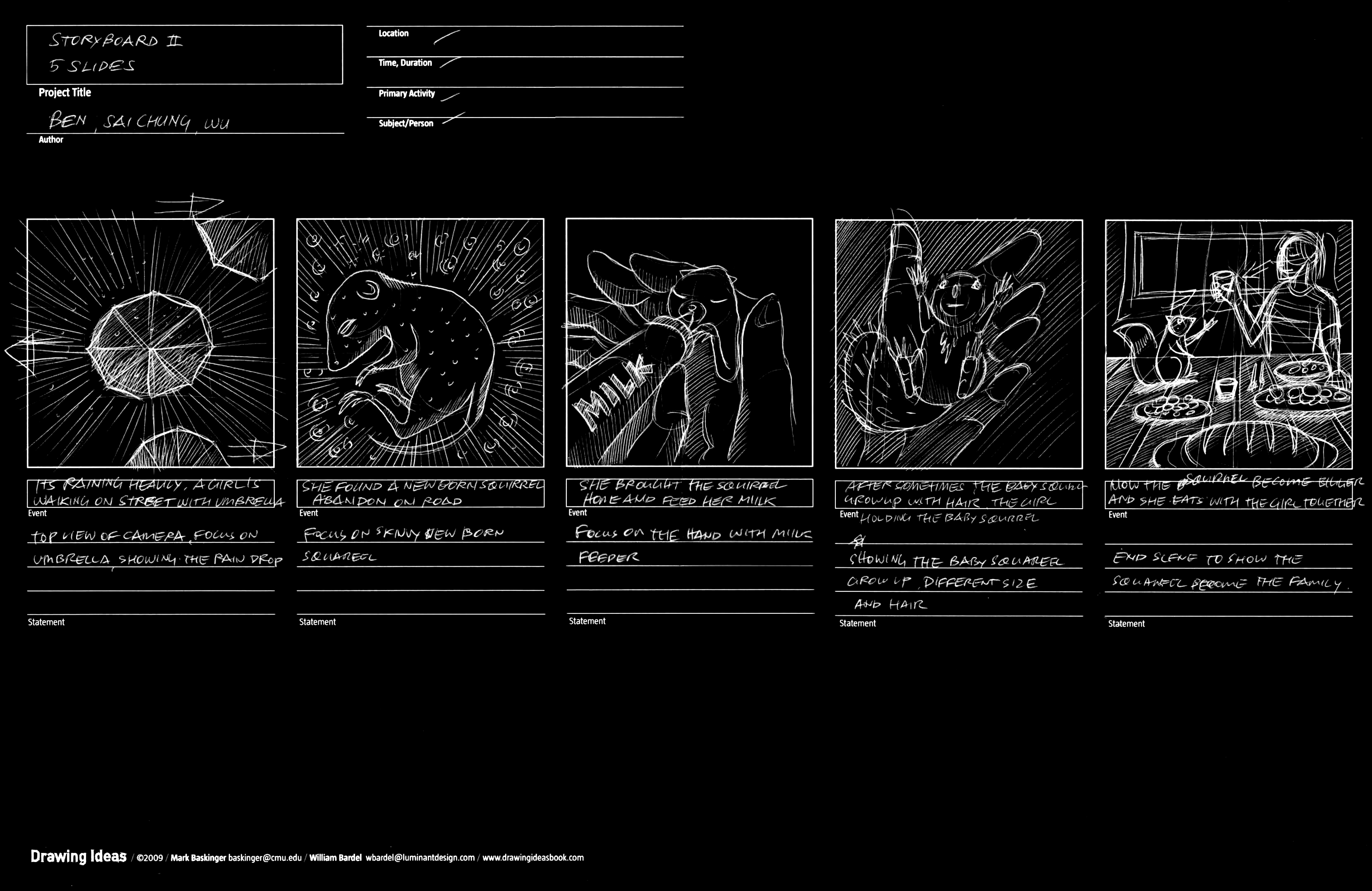This 5-panel storyboard follows an emotional narrative: on a rainy day, a girl finds an abandoned newborn squirrel, brings it home, nurtures it, and eventually forms a deep bond. The final frame shows them sharing a meal as family. This exercise trains my ability to visually sequence ideas, develop key story moments, and communicate emotion clearly through composition and gesture.
