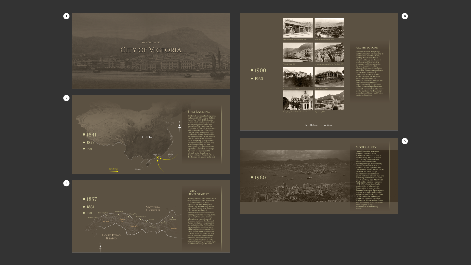 I selected “City of Victoria” as the theme, focusing on the colonial and urban development of Hong Kong from 1841 to 1940. After research, I began sketching layout ideas for each section, planning the scroll-based narrative flow and grid system to structure the one-page website clearly.