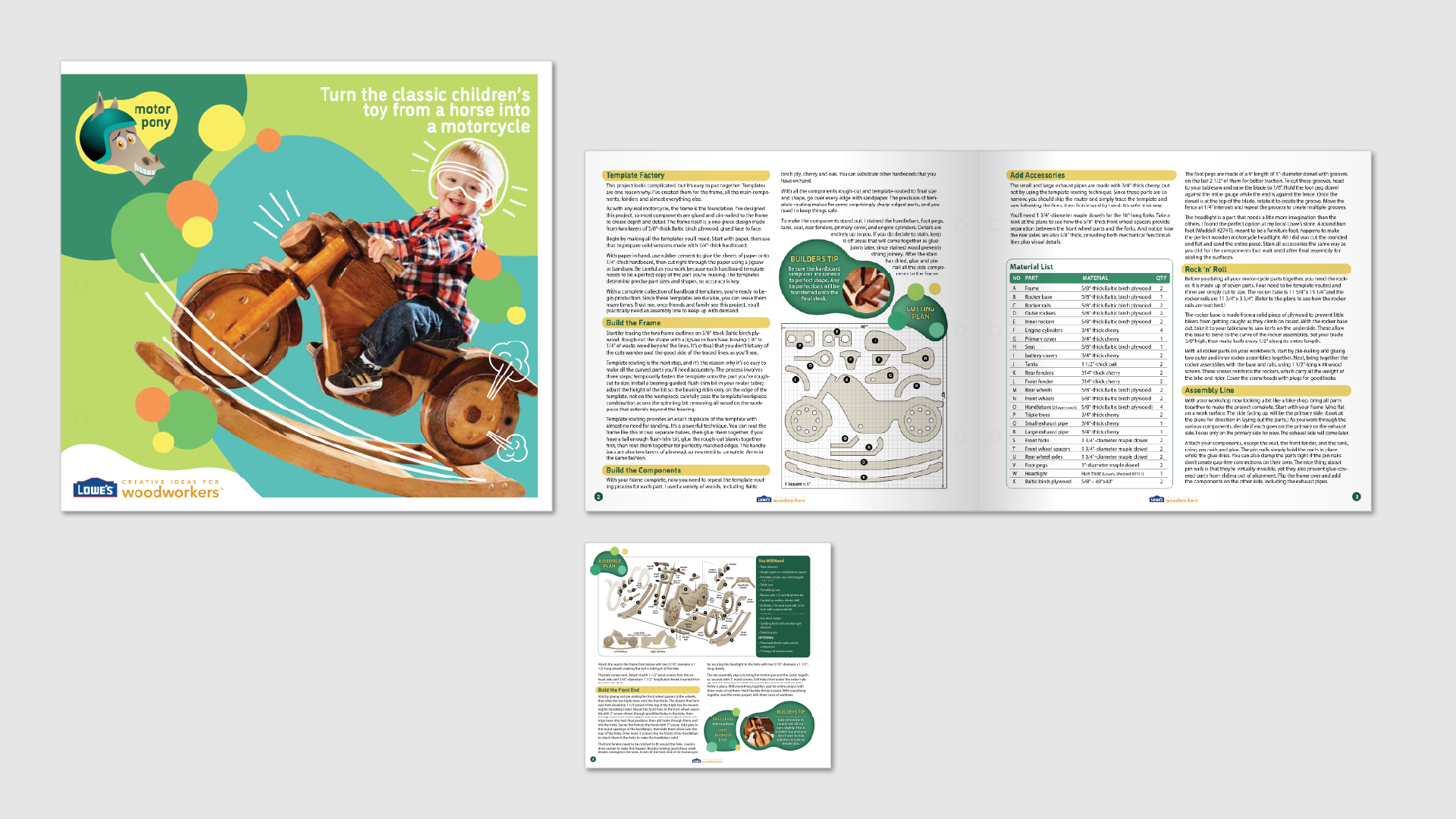 This assignment focuses on designing a 4-page brochure that visually communicates technical plans for a child’s play vehicle. Students must create a name, logo, and layout with consistent visual flow, combining illustration, instruction, and appealing design for amateur woodworkers.